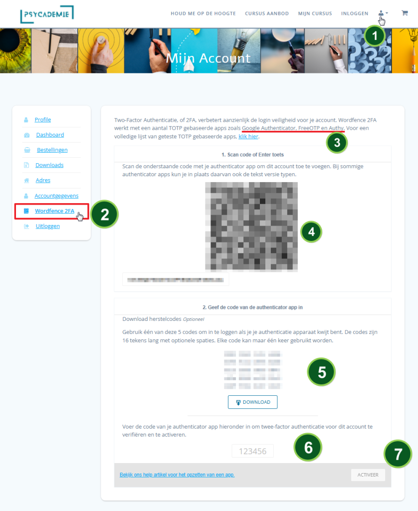 Klik op de knop “Activeren” om de 2FA in te schakelen voor je account (7).